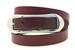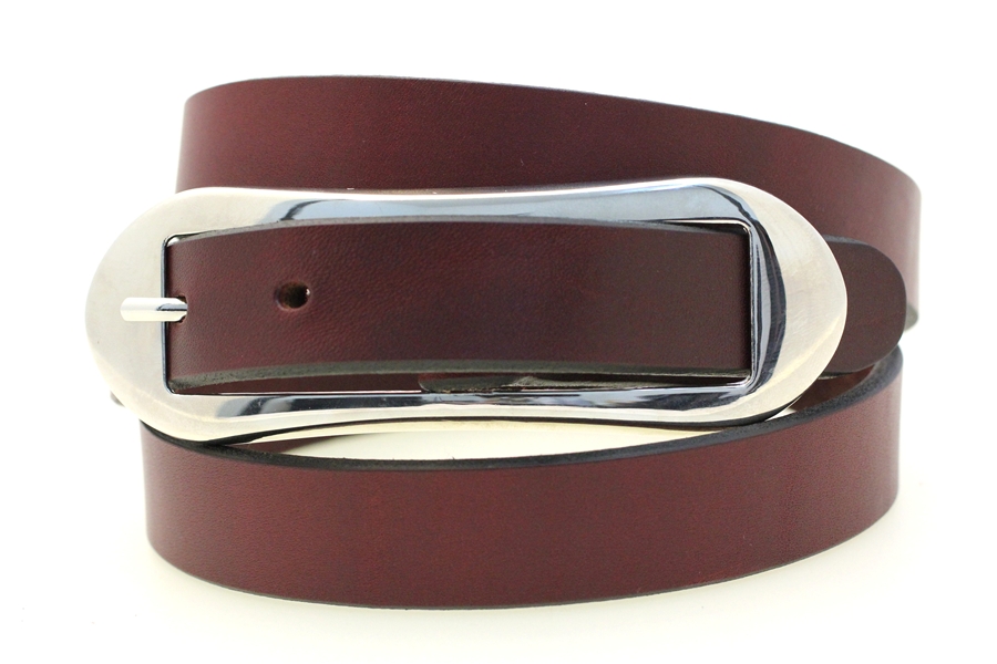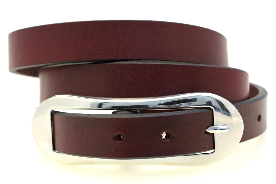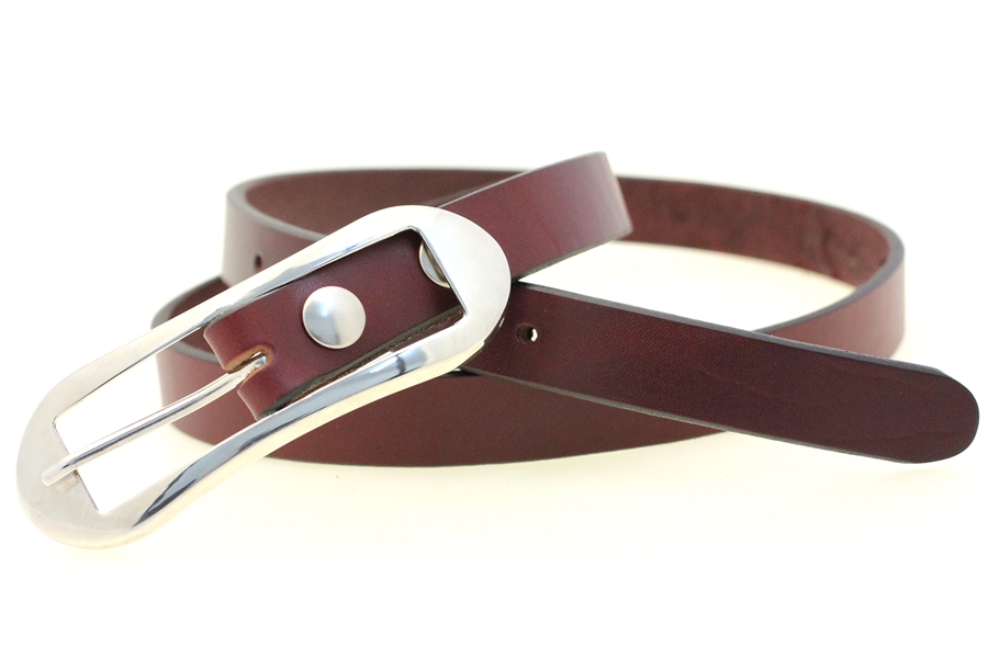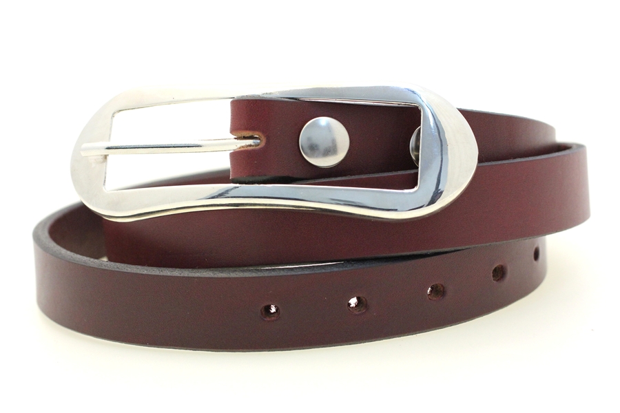 Ladies' 25mm (1") Burgundy Latigo leather belt. This leather belt can be worn as a waist or a hip belt. Great accessory for a dressy or casual look. Made of soft, supple Latigo leather, great when strength and flexibility are needed. The belt has an over-sized oval nickel buckle, and button snaps for easy buckle changing as well as durability. Made in America with pride.