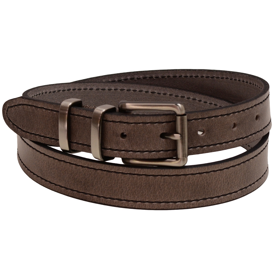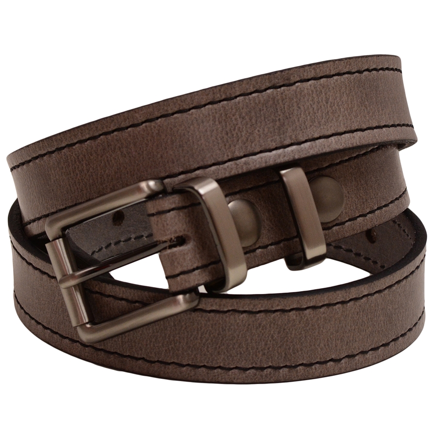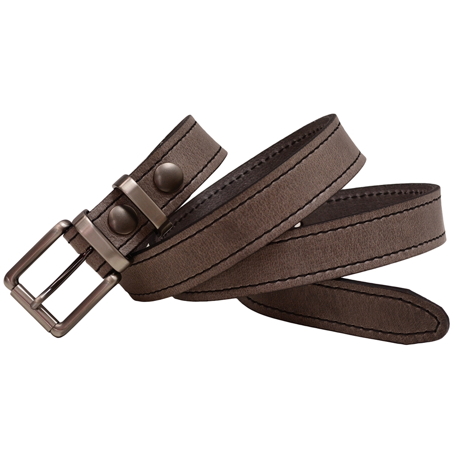 Men's 1 1/8" wide leather belt. Gorgeous buffalo leather in Crayon Gray color has a unique grain effect and a subtle pull-up effect, providing for a sharp, contemporary look. Decorative black stitching highlights the color of the leather. The leather is soft and supple, making it a perfect choice for a dress or casual attire. Features a roller buckle and double loop set in old nickel finish, and matching button snaps for easy buckle changing. Made in America with pride.