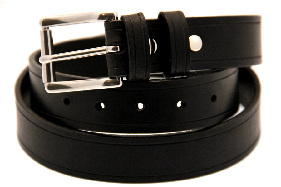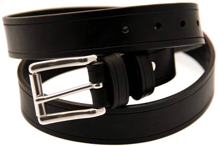 Orion Leather 1 1/4" black Latigo leather belt with saddle groove. This leather belt is soft, supple and great when strength and flexibility are needed. It has a stainless steel roller buckle and double loops, and screw posts for easy buckle changing as well as durability. Made in America with pride.