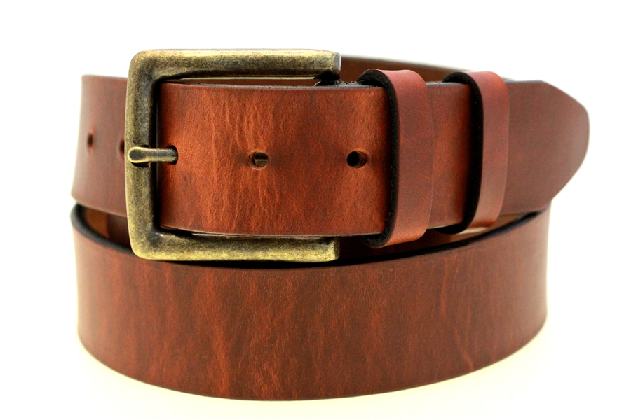 American Made Men's 1 1/2" Hot Dipped Tan Harness Leather Belt With Antique Brass Square Buckle